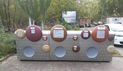 Punto limpio de proximidad ubicado en la puerta de acceso a la biblioteca Luis Martín en el barrio de Santa Eugenia del distrito Villa de Vallecas.